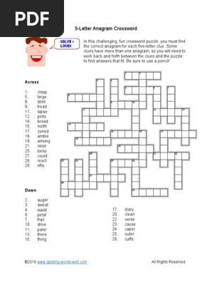 5 letter Crossword Clue | Wordplays.com The Crossword Solver found 30 answers to "5 letter", 5 letters crossword clue. The Crossword Solver finds answers to classic crosswords and cryptic crossword puzzles. Enter the length or pattern for better results. Click the answer to find similar crossword clues . Enter a Crossword Clue Sort by Length # of Letters or Pattern Dictionary