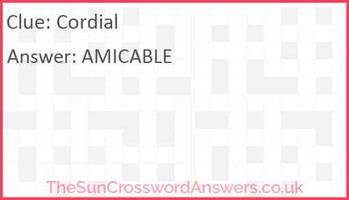 Cordial Crossword Clue and Answer - The Games Cabin Cordial Crossword Clue Answer Below is the potential answer to this crossword clue, which we found on within the LA Times Mini Crossword. It's worth cross-checking your answer length and whether this looks right if it's a different crossword though, as some clues can have multiple answers depending on the author of the crossword puzzle. WARM