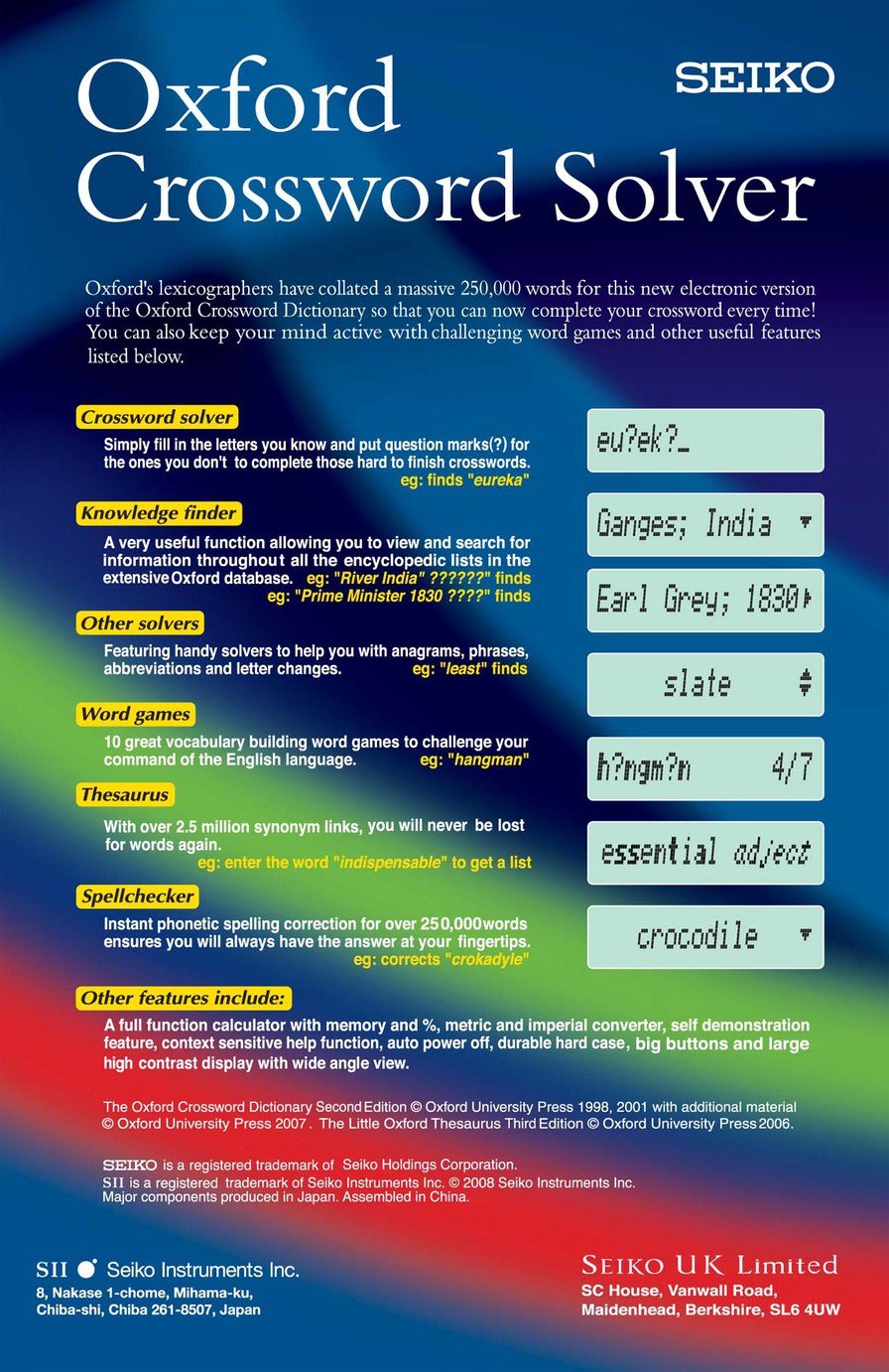 Seiko ER3700 Oxford Crossword Solver Thesaurus Spellchecker Calculator ... Seiko ER3700 Oxford Crossword Solver Thesaurus Spellchecker Calculator | Business, Office & Industrial, Office Equipment & Supplies, Office Equipment | eBay! Seiko Oxford Crossword Electronic Solver | eBay Find many great new & used options and get the best deals for Seiko Oxford Crossword Electronic Solver at the best online prices at eBay! Free shipping for many products!
